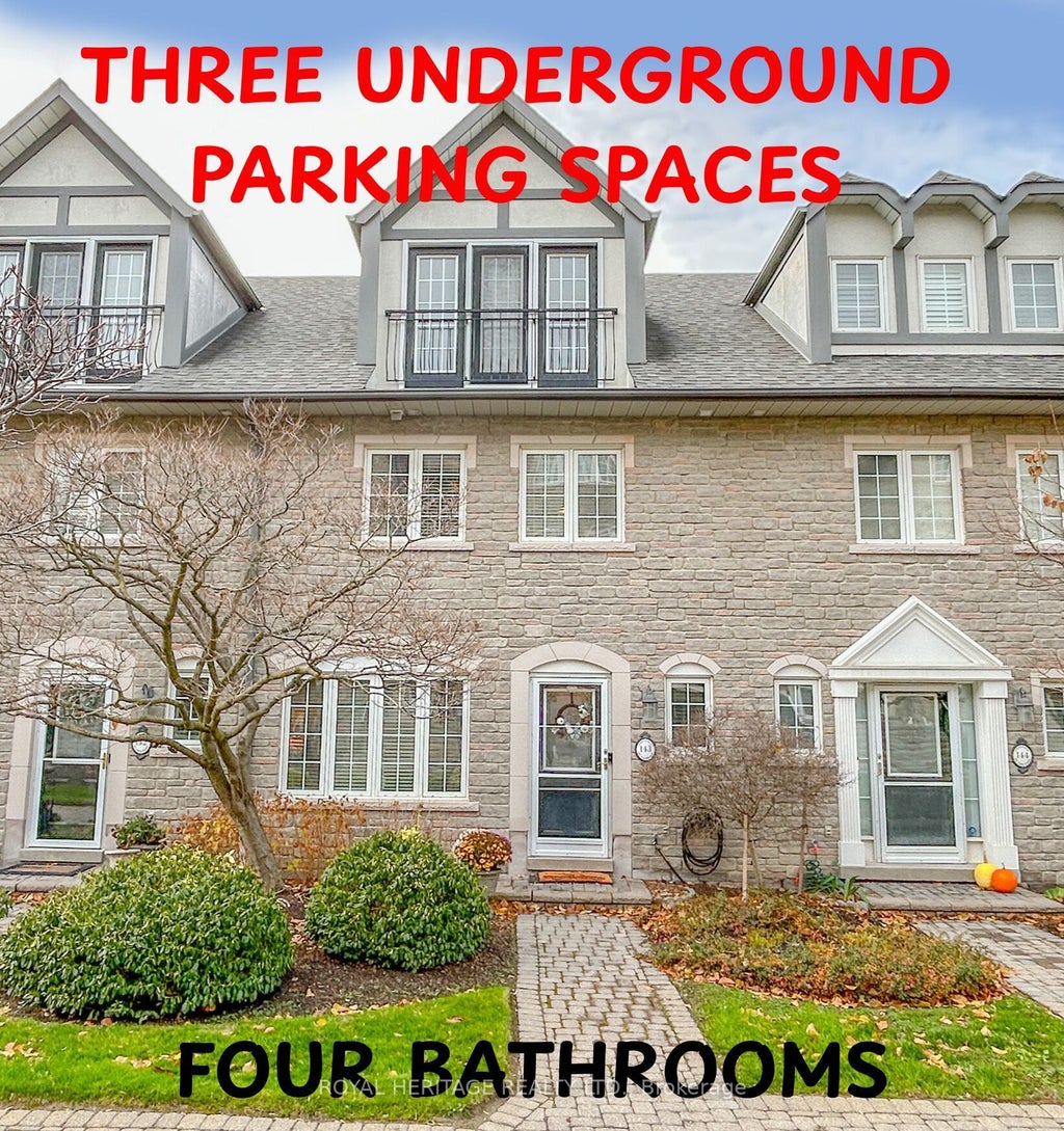 This outstanding executive townhouse with parking for 3 is ideally situated in the best block of Chateau By The Park. Built by Coughlan Homes & Spanning over 2,000 square feet across three generous floors plus a finished basement, the home features an open-concept main level with a formal dining room, a well-equipped kitchen and a family room complete with a gas fireplace. French doors open to a private west-facing deck, perfect for entertaining or unwinding. Upstairs, the second floor offers two large bedrooms-one with two walk-in closets & a four-piece bathroom, and a convenient laundry room. The entire third floor is dedicated to the luxurious primary bedroom suite, boasting a sitting area, a four-piece ensuite, his and hers closets, and a juliette balcony. The lower level provides a spacious recreation area, ample storage, a two-piece bathroom, and direct access to heated underground parking with two side-by-side spots at the door and an additional spot close by. Water tap for washing your car. Kitchen-Aid kitchen appliances are still under warranty, and recent upgrades include new two pc baths. Every level features a bathroom, and the property has very low annual heating and hydro costs. The complex is well maintained with all exterior maintenance-roof, doors, decks, tree replacement, and grass cutting-handled for you, supported by a large reserve fund for ongoing upkeep. Residents enjoy a range of amenities, including Rogers Xfinity cable, high-speed internet, water, parking, snow removal, landscaping, and exterior window maintenance included in the condo fees. The community offers a newly renovated party room for gatherings and a private mailroom for convenience, as well as abundant visitor parking and easy access to transportation and shopping, including quick entry to Highway 401. This well-appointed home presents a unique opportunity for spacious, comfortable, and maintenance-free living in a prime location. Be sure to click through the virtual tour